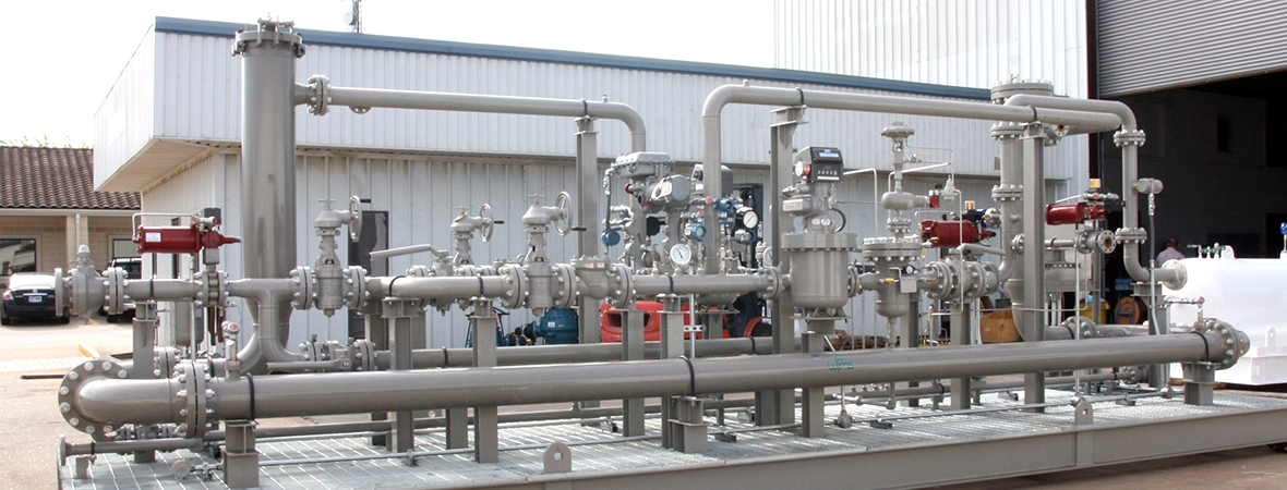 Liquid metering systems using positive displacement, turbine, helical, coriolis and/or ultrasonic meters complete with strainers, air eliminators, measurement control panels with HMI (Human Machine Interface) and SCADA systems (Supervisory Control and Data Acquisition System.)